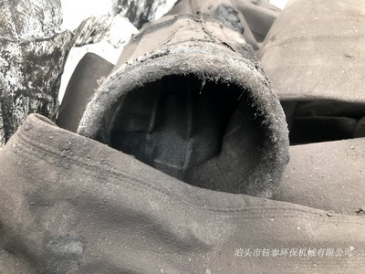除塵器使用地點(diǎn):寧夏石嘴山,除塵濾袋使用壽命:3年,除塵濾袋規(guī)格:500g滌綸針刺氈,粉塵類型:黑砂,粉塵特性:粗粉塵、濕度大,干燥時(shí)會(huì)變成固體并粉碎,工作溫度:低于60℃除塵器吸風(fēng)口處有一個(gè)除塵濾袋在袋口損壞,濾布完全成了黑色,由于缺少一個(gè)濾袋