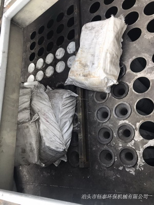除塵器吸風(fēng)口處有一個(gè)除塵濾袋在袋口損壞,濾布完全成了黑色,由于缺少一個(gè)濾袋,造成除塵器出風(fēng)口周圍的花板上有一堆灰塵。