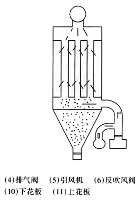 該除塵設備由含塵氣體入口至凈化煙氣出口,本體結構由進氣管路、進氣室、袋室、灰斗、排灰閥、出口管道及反吹風系統(tǒng)和清灰控制系統(tǒng)所組成。