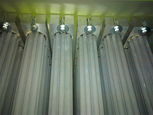 工業除塵技術的發展,由最早的水浴除塵--旋風除塵--電除塵---袋式除塵器--塑燒板除塵器。管式除塵器是高效、長壽命的燒結濾芯與布袋除塵器的創新結合。燒結濾筒由PE(PA)(聚乙烯)多孔基材+PTFE(聚四氟乙烯)嵌入式涂層,純粹的表面過濾,高效耐磨的燒結濾材,以波浪形的圓筒結構增大過濾表面積。過濾效率達99.999%,可捕集0.1um粒徑粉塵,排放濃度遠小于1mg/Nm³,疏水材質,易清灰、可清洗、無纖維脫落;