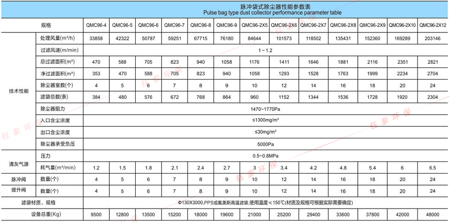 除塵清灰工作過程為:以一個袋為例,含塵氣體由進口處直接進入氣箱的袋室;由于有負壓風機的引力驅動作用,含塵氣體由外及里,自下而上,克服阻力,穿越濾袋到達上部箱體;粉塵就會被阻擋在濾器組件之外,小的顆粒被吸附在濾芯的表面,大的顆粒直接掉到下面的灰斗中;經過過濾后的含有微塵的氣體在脈沖提升閥處匯集,之后從出風口排出,此時便是干凈的氣體。過濾狀態就是對含塵氣體進行除塵。當過濾工作達到一定時間(或阻力達到預先設定值),清灰過程開始。其工作過程為:控制器發出信號,使脈沖提升閥關閉,阻斷排氣;壓縮空氣脈沖閥開啟,以大于0.5MPa的壓縮空氣經脈沖閥噴入凈氣室;并迅速膨脹入濾袋內,并產生振動作用,清除濾袋外側表面上的粉塵,粉塵掉落到灰斗。這個動作完成后(大約6~15s),壓縮空氣脈沖閥關閉,提升閥重新打開,該箱室的濾袋重新回到過濾狀態。