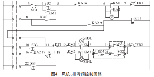 風(fēng)機、排污閥控制回路如圖4所示,圖中3~22為接線端子編號,KA14為基本水位繼電器常閉節(jié)點,除塵器長時間處于停運狀態(tài)并且排污閥存在漏水現(xiàn)象,水箱內(nèi)部大部分水流失。遠(yuǎn)程啟動風(fēng)機時,負(fù)壓對水箱水位造成波動,使基本水位信號消失,KA14斷開,風(fēng)機停運聯(lián)鎖排污閥打開,同時進水電磁閥動作,KT1計時時間到后排污閥關(guān)閉。關(guān)閉到位,進水電磁閥保持進水,基本水位信號亮起,KA14閉合,風(fēng)機啟動,造成基本水位信號消失。之后不斷循環(huán)以上步驟,浪費大量水源及影響設(shè)備正常運行,需要及時對排污閥漏水問題進行處理。