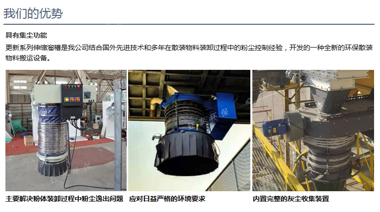 服務電話:13091153069(同微信)伸縮式卸料管是一種物料處理設備,用于將粉末和干散狀物料無塵地裝入或卸入容器、卡車和船只。它是一種自動化且靈活的解決方案,可以根據不同行業的需求進行定制。伸縮式卸料管系統的主要功能是通過垂直的鐵管利用物料自身的重量排放粉末或顆粒狀散裝固體,同時通過外層的一層帆布材料的布筒收集卸料時產生的粉塵。為了適應上部排放點和下部裝載點之間的不同高度,鐵管被設計為可伸縮的。鐵管的靈活性是伸縮式卸料管系統的關鍵特性,它允許根據不同的排放和裝載點進行調整,使其成為廣泛應用的多功能解決方案。